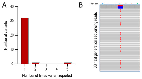 To test if the ACVRL1 c.1231C>T (p.Arg411Trp) predominance was also evident in non-UK laboratories, we examined pathogenic reports we had downloaded from the HHT Mutation Database as part of a separate study [71]. These reports had been generated by North American, European, African, and Asian genetic laboratories [41,79,89,90,91,92,93,94,95,96,97,98,99,100,101,102,103,104,105,106,107,108,109,110,111,112,113,114,115,116,117]. Within this database, there were 250 different reports for pathogenic ACVRL1 variants. Of these, 181/250 (72.4%) were reported only once, and 247/250 (98.8%) fewer than ten times (Figure 4A). Focusing on the 125 ACVRL1 missense variants, 83 (66.4%) were reported only once, and 122/125 (97.6%) fewer than eight times (Figure 4B).