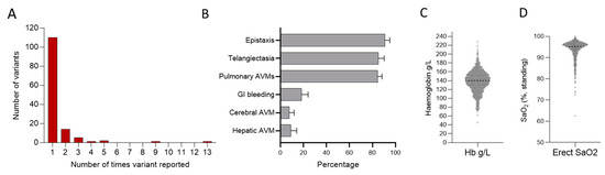 Series 2. Positive HHT gene tests in 501 patients with HHT reviewed between 1992 and 2020. (A) Overall number of times a variant was reported. (B) Major HHT manifestations across the population including nosebleeds (epistaxis), arteriovenous malformations (AVMs), and gastrointestinal (GI) bleeding. Note there is a strong referral bias due to a separate national pulmonary AVM referral service. Additionally, individuals referred with known or suspected HHT undergo routine screening for pulmonary AVMs, whereas imaging of the liver and brain for asymptomatic screens are not routinely performed. (C) First-recorded haemoglobin (Hb) and (D) first-recorded oxygen saturation (SaO2) in the erect posture.