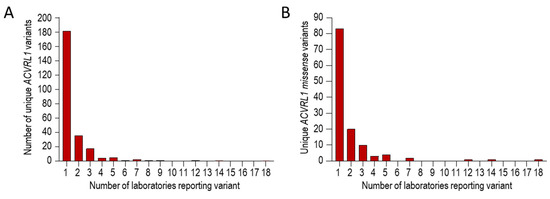 Series 3 ACVRL1 pathogenic reports on the HHT Mutation Database, itemised by number of different international laboratories reporting the variant [41,79,89,90,91,92,93,94,95,96,97,98,99,100,101,102,103,104,105,106,107,108,109,110,111,112,113,114,115,116,117]. Tabulated text data were downloaded in 2018 as described in [71], and were categorized before generating these graphs. (A) Overall number of times any ACVRL1 pathogenic variant was reported. (B) Overall number of times any missense ACVRL1 pathogenic variant was reported.