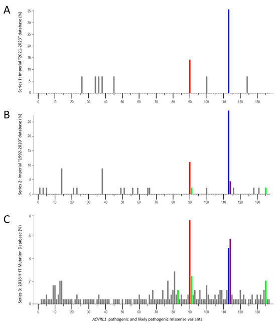 ACVRL1 missense variants in three essentially independent series, plotted as percentage of total ACVRL1 missense variants per series. Individual variants are numbered from 5′ to 3′ and detailed in Supplementary Table S1, annotated by NM_000020.3 [88]. (A) Series 1: Hammersmith/Imperial database, 2021–2023. (B) Series 2: Hammersmith/Imperial database, 1992–2020. (C) Series 3: HHT Mutation Database, 2018, as reported in Reference [71]. The three most common variants are highlighted in red (ACVRL1 c.1120C>T, p.(Arg374Trp), blue (ACVRL1 c.1231C>T, p.(Arg411Trp), and purple (ACVRL1 c.1232G>A, p.(Arg411Gln). Also highlighted in green are the other cell surface-expressed, BMP9-binding but kinase-dead variants in the series (ACVRL1 c.1039G>C, p.(Arg347Pro); ACVRL1 c.1121G>A, p.(Arg374Trp); and ACVRL1 c.1450C>T, p.(Arg484Trp)).