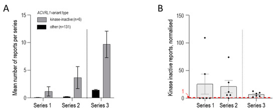 ACVRL1 missense variants comparing the 6 encoding kinase-inactive, cell surface-expressed ALK1 protein compared to 131 other ACVRL1 pathogenic/likely pathogenic missense variants reported in the 3 series as detailed in Supplementary Table S1. (A) Mean number of reports of individual variants per category (encoding cell surface-expressed, kinase-inactive protein [N = 6] or other missense variant [N = 131]) in each of the 3 series. Mean and standard error of mean reports per variant displayed. (B) Number of reports for each of the 6 kinase-inactive variants per series, normalised to the mean number of reports for the other ACVRL1 variants in that series. Individual variant values, mean, and standard error of mean are displayed. For Series 1 and 2, kinase-inactive variants that were not identified have a value of zero (compare Figure 5). A red dotted line at 1 indicates where the expected value would be if, for a kinase-inactive variant present in that series, there was no difference from the other ACVRL1 variants in that series.