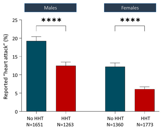 Notably, clinical data in HHT support a hypothesis of reduced atherosclerosis. Reduced end-organ phenotypes were first reported in HHT by Alan Guttmacher in 1997, using a survey where HHT patients self-reported low rates of atherosclerosis and angina [126], concluding “If the suggestion of relatively low incidence of atherosclerosis in a primary disease of the vasculature persists after tabulation of remaining questionnaires, it deserves more careful analysis.” We also reported anecdotal data in 2009, based on the paucity of thrombolytic queries for HHT patients in a then 800-strong clinical service [127]. These observations [126,127] led to incorporation of unbiased cardiac histories in a wider ethically approved survey designed to capture multiple datasets from antecedent relatives of each respondent [63]. As shown in Figure 7, for 6047 individuals in HHT families (2827 with HHT and 3011 without HHT), whether categorised by all cases, or by males and females separately, the HHT group had fewer reported myocardial infarctions (heart attacks, all p-values < 0.0001) [63]. Given the potential HHT-specific complications that would confound any benefit from reduced atherosclerosis in HHT (e.g., higher cardiac outputs due to anaemia and systemic AVM-induced reductions in systemic vascular resistance; and paradoxical emboli through pulmonary AVMs that can occlude cerebral and coronary arteries directly), the HHT data shown in Figure 7 are remarkable and, until now, defied explanation.