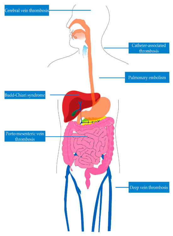Venous thromboembolism (VTE) is one of the deadliest complications in patients with IBD. VTE is a medical condition characterized by inappropriate formation of blood clots. It encompasses deep vein thrombosis (DVT) and pulmonary embolism (PE). While DVT usually occurs in the deep veins of the lower extremities, it may also occur in deep veins of the upper extremities, mesenteric veins, portal vein, hepatic veins (Budd-Chiari syndrome), and cerebral veins, as seen in Figure 1 [7,8,9,10,11,12,13,14,15]. In the United States, each year, more than half a million hospitalizations have been linked to VTE [16]. Following an initial VTE episode, potential long-term complications encompass post-phlebitic syndrome, pulmonary hypertension, and the likelihood of the condition recurring [17,18,19]. Quality of life can be negatively impacted for up to four months following a DVT. Those with post-thrombotic syndrome endure a further decline in their quality of life during this time, showing changes similar to those found in individuals with chronic heart, lung, or arthritic conditions [20]. Some groups of VTE patients need prolonged anticoagulation to prevent more clots, affecting their quality of life and heightening their risk of bleeding episodes. The total healthcare expenses associated with VTE amount to approximately USD 5–10 billion annually in the United States [3]. As several known risk factors like aging, surgical procedures, immobility, and obesity become more prevalent, VTE emerges as a significant and growing public health concern [21,22,23]. To assess the public’s knowledge regarding DVT, encompassing its symptoms and risk factors, the CDC included DVT-related questions in the 2007 HealthStyles survey [21]. Remarkably, only 38% of respondents accurately identified DVT as a blood clot within a vein. Most participants were unable to identify common risk factors for DVT (SEC, unpublished observations, 2009).