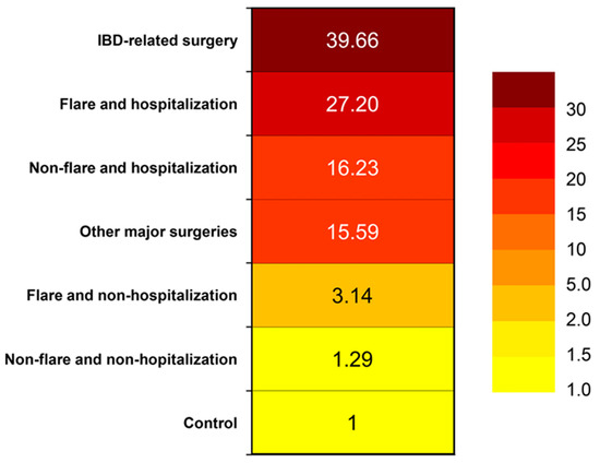 Hospitalization, particularly if secondary to an IBD flare or surgery, emerges as a significant factor that notably heightens VTE risk. A retrospective study evaluated hospital discharges and revealed that individuals with ulcerative colitis (OR 1.85, 95% CI 1.70–2.01) or Crohn’s disease (OR 1.48, 95% CI 1.35–1.62) experienced higher VTE rates compared to non-IBD patients who were discharged [25]. Kim et al. conducted a cohort study using Korean National Health Insurance claims data to estimate the risk of VTE over various time frames [15]. The risk of VTE by disease activity and hospitalization was calculated. The risk of VTE during a non-hospitalized flare in IBD patients was higher compared with controls (adjusted HR, 2.86; 95% CI, 1.70–4.80). The risk of VTE increased to a much greater degree during a hospitalized flare (adjusted HR, 19.36; 95% CI, 9.59–39.07) and even during hospitalization without a flare (adjusted HR 12.97; 95% CI, 8.68–19.39). The highest risk of VTE was at the time of IBD-related surgery (adjusted HR, 40.81; 95% CI, 10.16–163.92). The risk of VTE during other major surgeries was increased (adjusted HR, 15.44; 95% CI, 7.65–31.12) [15]. A heat map showing the risk of VTE is shown in Figure 2.