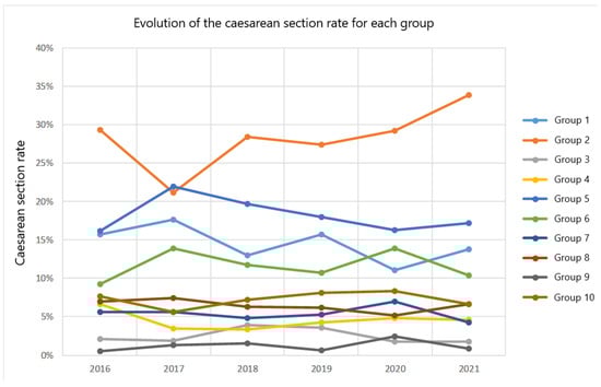 The changes in the number of women in the period 2016–2021 compared to 2016 according to Robson groups are shown in Supplementary Table S1. The largest Robson group was group 1 (3008 women), followed by group 3 (2763 women). The third largest group was group 2 (1752 women). It can be seen that the number of women in this group has increased over the years, i.e., more planned caesarean sections and inductions in nulliparous women were performed at Leon Hospital each year. The three groups together account for a total of 7523 deliveries, which represents 72.92% of all analysed deliveries. The least numerous group is group 9, in which 100% of caesarean sections were performed.