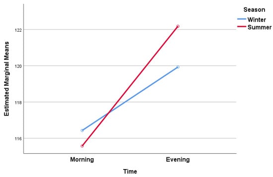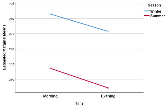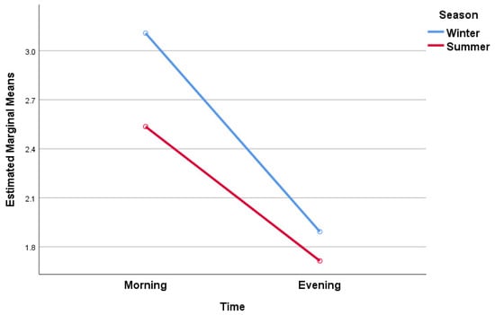 We can observe that the main effects of the season are statistically significant at p < 0.001, with Partial Eta Squares (0.432) indicating large effect sizes (values higher than 0.40) [42]. Additionally, in this case, the Observed Power (0.992) was greater than 80% and therefore, we can conclude that the sample size was adequate. However, the main effects of time and the season * time interaction were not statistically significant.