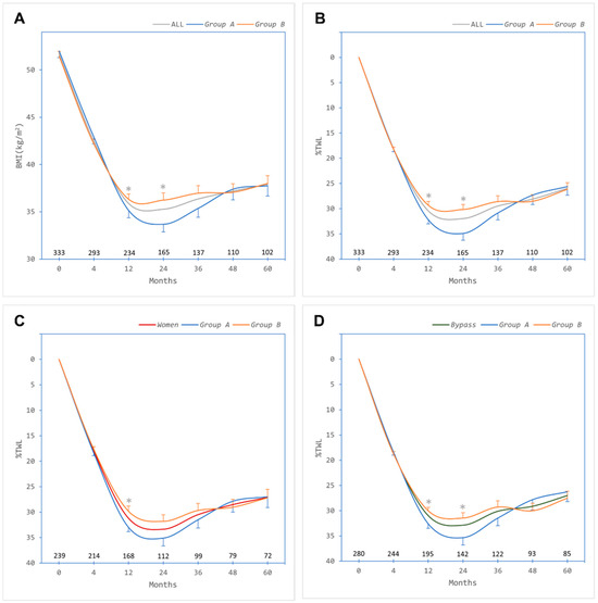 Overall baseline mean ± SD weight and BMI were 142.6 ± 27.1 kg and 51.7 ± 7.5 kg/m2, respectively. There was a significant reduction in BMI overall and in both groups (Figure 1A). Maximum %TWL at 24 months after bariatric surgery was 31.9% overall and 34.9% in Group A vs. 30.2% in Group B (p = 0.006); however, there were no significant differences in %TWL at 36, 48, and 60 months between groups (Figure 1B). Amongst women (who constituted 72% of the total cohort), there was no significant difference between Group A and Group B (Figure 1C). Similarly, amongst patients who had undergone RYGB (who constituted 84% of the total cohort), there was no significant difference in %TWL between Group A and Group B (Figure 1D).