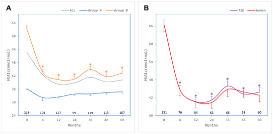 Glycaemic outcomes after bariatric surgery. (A) Glycated haemoglobin (HbA1c) in all patients (ALL, grey trace) and categorised by absence of metabolic syndrome (Group A, blue trace) or presence of metabolic syndrome (Group B, orange trace). (B) HbA1c in patients with type 2 diabetes (T2D, purple trace) and in females (Women, red trace), who constituted 62% of the people with T2D. Numbers of patients contributing data at each timepoint are depicted above the x-axis. Error bars, standard errors of the means. * Significant difference at timepoint compared with baseline (paired samples Student t test).