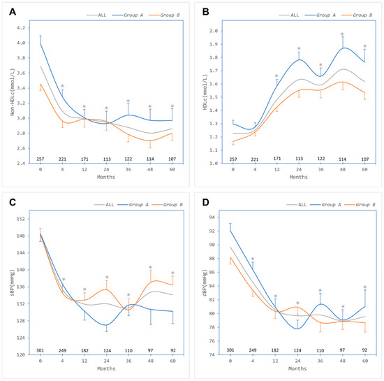 Lipid and blood pressure outcomes after bariatric surgery in all patients (ALL, grey trace) and categorised by absence of metabolic syndrome (Group A, blue trace) or presence of metabolic syndrome (Group B, orange trace). (A) Non-high-density lipoprotein cholesterol (Non-HDLc). (B) High-density lipoprotein cholesterol (HDLc). (C) Systolic blood pressure (sBP). (D) Diastolic blood pressure (dBP). Numbers of patients contributing data at each timepoint are depicted above the x-axis. Error bars, standard errors of the means. * Significant difference at timepoint compared to baseline (paired samples Student t test).