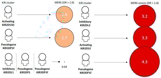 Risk effects of MERS stages against KIR clusters. OR, odd ratio; OR > 1.0, risk effect; OR < 1.0, protective effect.