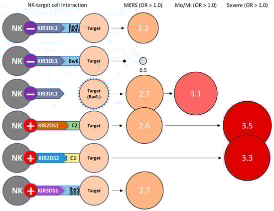 Risk effects of MERS stages against NK-target cell interactions. OR, odd ratio; OR > 1.0, risk effect; OR < 1.0, protective effect; Mo/Mi, moderate and mild; −, inhibitory KIRs; +, activating KIRs.