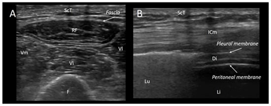 Normal features of diaphragm and quadriceps muscle. The figure shows the features that can be seen with skeletal muscle ultrasound. Left Panel (A): a transverse scan of the thigh allows for the visualization of the quadriceps muscle, which is composed of the rectus femoris (RF), the vastus lateralis (Vl), the vastus medialis (Vm), and the vastus intermedius (Vi); the hyperechoic, curvilinear image on the lower part of the figure, with the anechoic shadow is the femur (F), while on the upper part of the image, the subcutaneous tissue is shown (ScT). Right panel (B): a longitudinal scan of the chest wall at the zone of apposition allows for the visualization of the diaphragm at the zone of apposition (i.e., the area of attachment between the diaphragm directly behind the inner aspect of the lower chest wall and rib cage). Lu: lung; ScT: subcutaneous tissue; ICm: intercostal muscles; Li: liver; and Di: diaphragm.