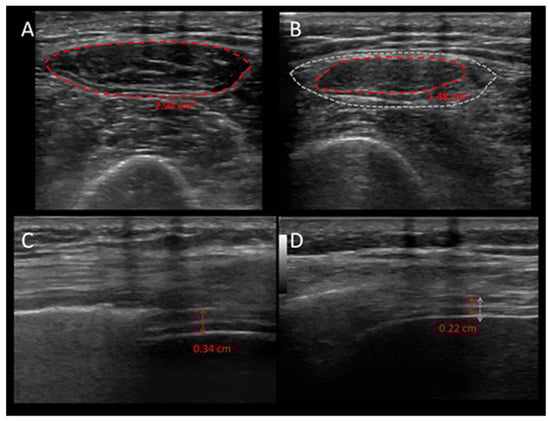 Ultrasonographic images of the quadriceps muscle and the diaphragm during the first week of ICU stay of a critically ill patient. The figure shows the images of the quadriceps muscle (upper panels (A,B)) and the diaphragm (lower panels (C,D)) of a critically ill patient during the first (left panels) and seventh day of ICU stay (right panels) and highlights the loss in muscle mass. Upper panels: The red, shaded line represents the cross-sectional area of the rectus femoris muscle; the grey, shaded area in panel (B) is the cross-sectional area of the first ICU day, and highlights the reduction in mass of the muscle. Lower panels: the red arrows show the diaphragm end-expiratory thickness; the grey, shaded line in panel (D) is the end-expiratory diaphragm thickness of the first ICU day.