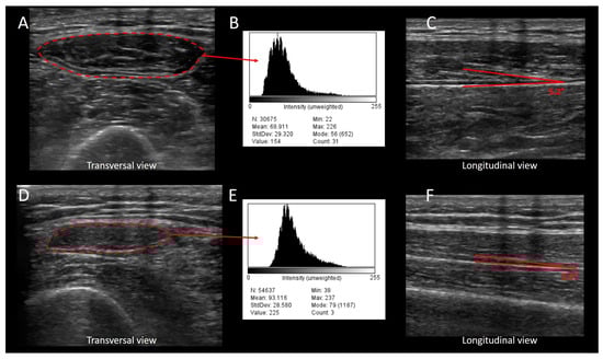 Change in rectus femoris echogenicity and pennation angle for a critically ill patient during the first week of ICU stay. The figure shows images of the quadriceps muscle of a critically ill patient during the first (upper panels) and seventh day of ICU stay (lower panels), and highlights the loss in muscle architecture. (A): the rectus femoris muscle is insonated with a transversal scan of the thigh; the red, shaded, line represents the cross-sectional area of the rectus femoris muscle; (B): the pixel enclosed in the red, shaded area of the rectus femoris cross-sectional area in panel (A) was analyzed for echo-genicity; (C): the rectus femoris muscle is insonated with a longitudinal scan at the same point of image (A); the pennation angle is shown by the red lines. Images (D–F) represent the same muscle of the same patient after 7 days of ICU stay. In the late image (panel (E)), the overall histogram is shifted to the right compared to the admission data (Panel (B)); moreover, the mean echo-intensity value increases from 68.9 to 93.1, indicating a brighter muscle, which is generally what happens with in-flammation or edema.