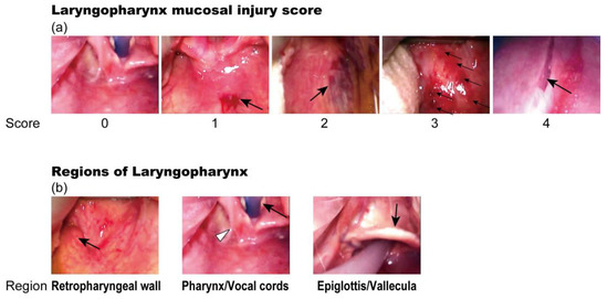 Evaluation of laryngopharyngeal mucosal injury after nasogastric tube insertion. (a) Laryngopharyngeal mucosal injury was evaluated using injury scores: 0, no injury; 1, erythema (arrow); 2, hematoma (arrow); 3, more than 10 spots of erythema and hematoma (arrows); and 4, laceration (arrow); (b) The three regions of the laryngopharynx (retropharyngeal wall (arrow indicates the uvula), pharynx (white arrowhead indicates the hypopharynx, and black arrow indicates the vocal cord), and epiglottis/vallecula (arrow indicates the epiglottis)) were evaluated separately. The highest score for each region was defined as the injury score for that region. The sum of the injury scores of the three regions was used as the score for the patient.