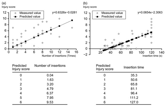 Regression lines for the insertion number, insertion time, and injury score. Regression lines are helpful in predicting the injury score (p < 0.05). (a,b) These regression lines suggested that the predicted injury score was low in cases where the nasogastric tube could be inserted blindly within a short duration and with a lower insertion number.