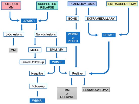 - Hillengass, J.; Usmani, S.; Rajkumar, S.V.; Durie, B.G.M.; Mateos, M.-V.; Lonial, S.; Joao, C.; Anderson, K.C.; García-Sanz, R.; Riva, E.; et al. International Myeloma Working Group Consensus Recommendations on Imaging in Monoclonal Plasma Cell Disorders. Lancet Oncol. 2019, 20, e302–e312. [Google Scholar] [CrossRef]