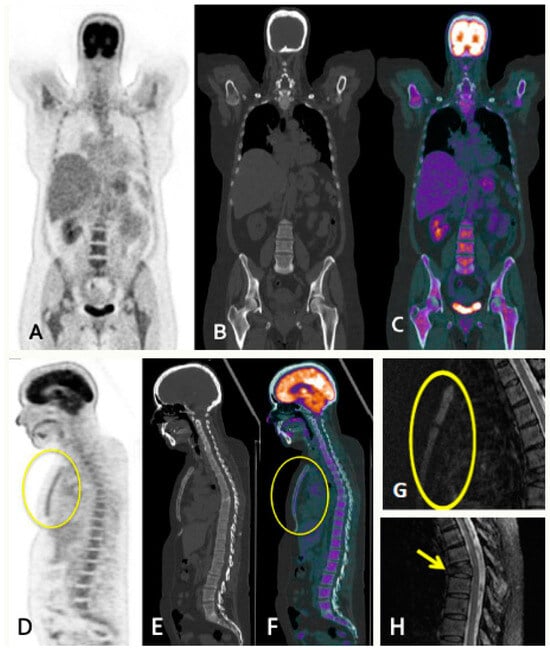 - Galán González, I.; Santos Salas, X.; Campos Rivas, R.; Idoate Ortueta, C.; Muñoz Olmedo, J.M.; Gómez León, N.N. Comparación Entre La RM y La 18FDG PET/TC En El Diagnóstico de Los Plasmocitomas Con Correlación Anatomo Patológica. Seram 2018. Available online: https://www.piper.espacio-seram.com/index.php/seram/article/view/2921 (accessed on 30 August 2023).