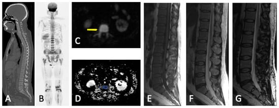 - Diffuse pattern: Diffuse disease can be suspected from a diffuse decreased signal on T1WI (either iso- or hypointense to intervertebral discs and muscle) and a diffuse increased signal throughout the marrow on T2FSWI, STIR, or high b-value DWI. Marrow ADC values above 600–700 μm2/s in a nontreated and newly diagnosed patient with MM could be used to increase confidence for the diagnosis of diffuse marrow involvement [33] (Figure 7). Due to potential false-positive findings, diffuse disease in imaging must be supported by bone marrow trephine biopsy [26].