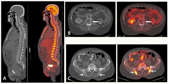 - Nanni, C.; Zamagni, E.; Cavo, M.; Rubello, D.; Tacchetti, P.; Pettinato, C.; Farsad, M.; Castellucci, P.; Ambrosini, V.; Montini, G.C.; et al. 11C-Choline vs. 18F-FDG PET/CT in Assessing Bone Involvement in Patients with Multiple Myeloma. World J. Surg. Oncol. 2007, 5, 68. [Google Scholar] [CrossRef] [PubMed]