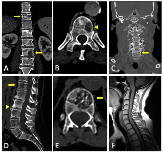 - Gaudino, S.; Martucci, M.; Colantonio, R.; Lozupone, E.; Visconti, E.; Leone, A.; Colosimo, C. A Systematic Approach to Vertebral Hemangioma. Skeletal Radiol. 2015, 44, 25–36. [Google Scholar] [CrossRef]