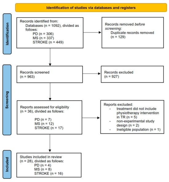 All three pathologies were represented in the selected studies, including stroke (n = 16) [24,25,26,27,28,29,30,31,32,33,34,35,36,37,38,39], MS (n = 8) [16,40,41,42,43,44,45,46], and PD (n = 4) [47,48,49,50,51]; among the 28 included studies, 26 were RCTs and 2 [25,50] were CCTs, investigating the efficacy of TR for addressing motor impairments.
