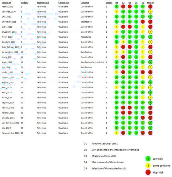 - Bias due to missing outcome data: Twenty-one studies received a low risk-of-bias rating. Five studies received a high risk-of-bias rating [24,30,45,46,47]. The reason for this rating was the same as for the previous domain.