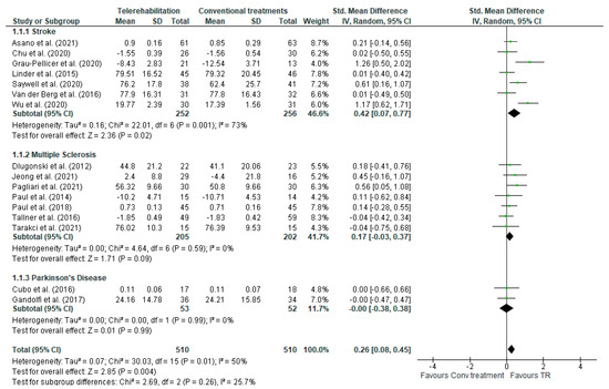 We planned to perform subgroup analysis according to neurological diseases (i.e., stroke, PD, MS). Statistical heterogeneity was assessed with the I2 statistic, establishing the cut-off value at 50%.