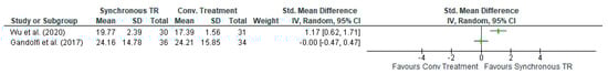 To assess the effects of synchronous TR on QoL compared to conventional treatment, two studies were included in the analysis, one for stroke [SMD (95% C.I) = 1.17 (0.62, 1.71)] and one for PD [SMD (95% C.I) = −0.00 (−0.47, −0.47)]. The results of individual studies were reported as they could not be combined due to pathology heterogeneity (Figure 4).