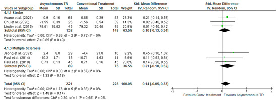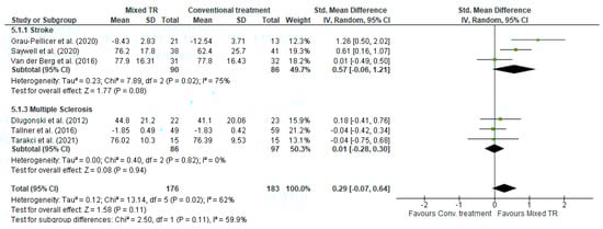 A total of six studies with 359 participants were included in the comparison between mixed TR and conventional treatments for the improvement of QoL. No statistically significant differences were found for either the overall effect [SMD (95% C.I) = 0.29 (−0.07, 0.64), I2 = 61%] or the stroke [SMD (95% C.I) = 0.57 (−0.06, −1.21), I2 = 75%] or MS [SMD (95% C.I) = 0.01 (−0.28, −0.30) I2 = 0%] subgroups (Figure 6).