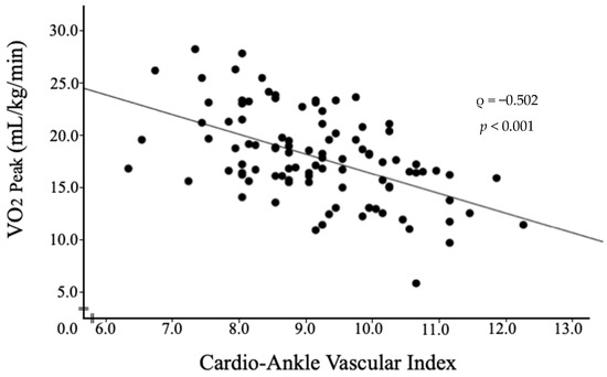 The relationship between the CAVI value and other clinical parameters was also analyzed using Spearman’s rank correlation coefficient. Finally, the variance inflation factor was examined to assess multicollinearity among the indicators significantly correlated with VO2 Peak. Forced-entry multiple regression analysis was used to investigate the VO2 Peak determinants. The results are expressed as the median (interquartile range (IQR)). The statistical significance level was set at 5%, and the analysis was conducted using SPSS Ver29.0 (IBM, Chicago, IL, USA).