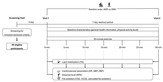 Whole-body vibration (WBV), functioning as a passive exercise, is an alternative therapeutic exercise. Vibration is a mechanical stimulus characterized by oscillatory motion, generating force to the muscle. Several systematic reviews and review articles have documented the effect of WBV in individuals who have musculoskeletal and neuromuscular deficits. Of these, WBV has the potential to gain bone mineral density in women with postmenopausal osteoporosis [20], improve neuromuscular performance [21], and enhance motor function in neurological disorders [22]. While this literature points out several health advantages, little is known about the effects of WBV on metabolic-related outcomes. Most previous studies conducted in animal models have evident beneficial effects of WBV on lipid mobilization, such as lowering cholesterol and triglycerides [23,24,25]. In addition, a previous study focusing on the acute effects of warm-up with vibration before (AER) on fat oxidation found that an additional WBV during warm-up had greater fat oxidation than warm-up without vibration in obese men [26]. However, no study has compared the effects of AER with WBV on metabolic-related outcomes in obesity. Regarding low cardiorespiratory fitness in obesity, a recent study suggested a vibration frequency at 30 Hz for obesity due to a non-impact effect on cardiovascular parameters [27]. It is likely that WBV at this frequency would be an advantage to obesity, especially in individuals who are unfit. Thus, this study aims to investigate the effects of AER and WBV on fat oxidation, lipid mobilization, cardiovascular responses, and dyspnea level in obesity.