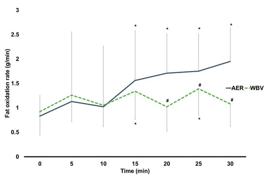 Changes within and between AER and WBV groups on fat oxidation. AER, aerobic. exercise; g/min, gram per minute; min, minute; WBV, whole-body vibration; #, between-group significant difference; *, significant difference when compared to baseline.