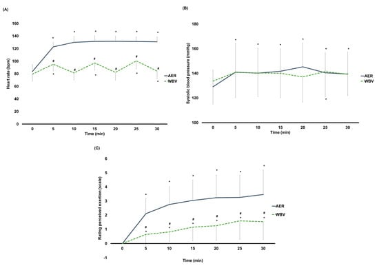 (A) Changes within and between AER and WBV groups on heart rate. (B) Changes within and between AER and WBV groups on systolic blood pressure. (C) Changes within and between AER and WBV groups on rating perceived exertion. AER, aerobic exercise; bpm, beat per minute; min, minute; mmHg, millimeter of mercury; WBV, whole−body vibration; #, between−group significant difference; *, significant difference when compared to baseline.