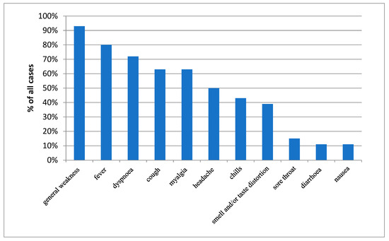 Another analyzed area was the impact of symptoms present during the acute phase of the disease on the results of PFTs. The presence of symptoms was assessed using a questionnaire that patients were asked to complete at each follow-up visit. The questionnaire covered the following symptoms: general weakness (present in 93% of all patients), fever (80%), dyspnea (72%), cough (63%), muscle pain (63%), headache (50%), chills (43%), smell and/or taste disorders (39%), sore throat (15%), diarrhea (11%), and nausea (11%) (Figure 1).
