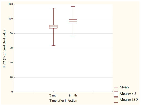 Changes in the results of various parameters included in PFTs performed at both follow-up visits were also analyzed. The change in the obtained results was significant only for the FVC parameter (p < 0.05)—after 3 months, the mean was 94.3% for the FVC (SD: 10.5%), while after 9 months, the mean was 96.8% (SD: 10.1%); p < 0.05 (Figure 2).