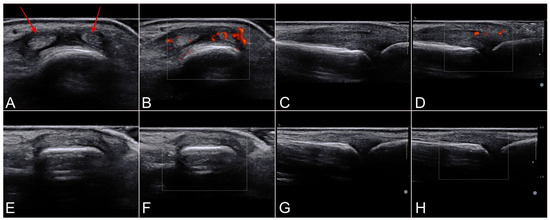 Preoperative high-resolution ultrasound (case 4, 24-year-old female). Transverse/axial ages in B-mode (A), color Doppler (B), sagittal images in B-mode (C) and color Doppler (D) showing hyperemia and (red arrows) gap through the EDM on the pathological side. Contralateral comparative images (E–H).