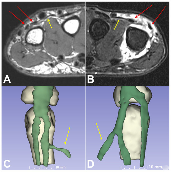 Representative MR images (case 1, 25-year-old male). Axial T1-weighted on the healthy side (A) and axial fat-suppressed T2-weighted with arthrography on the pathological side (B). MRI revealed a gap between the two tendon slips of the EDM (red arrows) on the pathological side. Using 3D reconstruction based on MRI, the maximum distance between the two tendons of the EDM was 7.2 mm on the injured side (D) and 1.5 mm on the contralateral side (C). The JT of the fourth inter metacarpal space (yellow arrow) was in continuity with the EDM on the pathological and contralateral side.