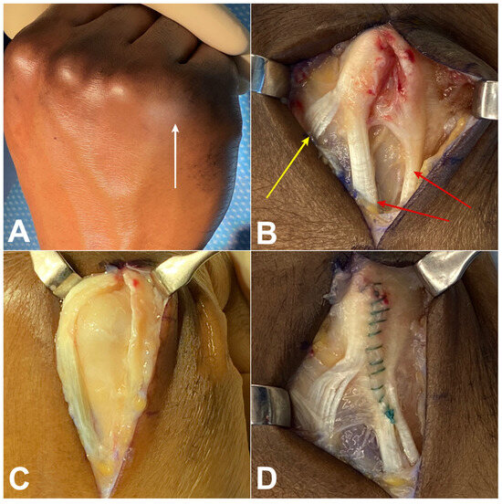 Preoperative photograph (case 3, 27 year-old male) of the dorsal aspect of the hand showing swelling (white arrow) over the 5th MCP joint (A). Intraoperative photographs showing the gap between the two tendons (red arrows) of the EDM (B) that increases with MCP flexion (C) Results after running suture of the EDM to close the space between the two tendinous slips (D). Note that JT type 3y (yellow arrow) remains attached to the radial tendon of the EDM.