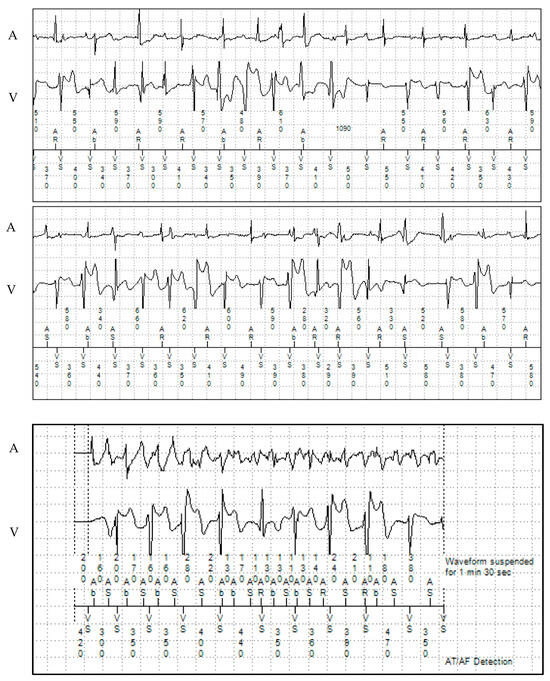 Episode of atrial fibrillation on remote monitoring with the dual-chamber ICD in patient 2. A: atrial electrogram; V: ventricular electrogram.