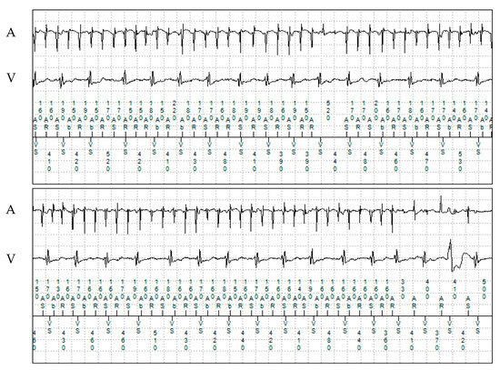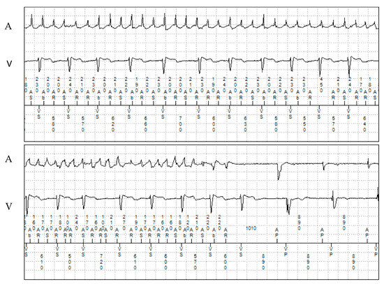 Episode of atrial tachycardia and ventricular ectopy in patient 2. A: atrial electrogram; V: ventricular electrogram.