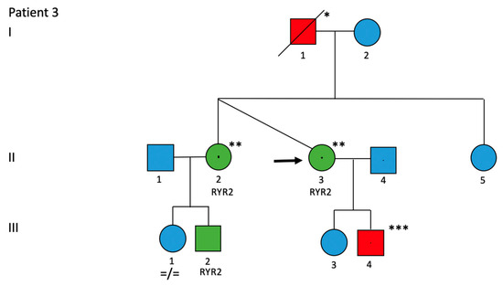 Patient 3, RYR2: c.1069G>A p.(Gly357Ser). Roman numerals indicate each generation; Arabic numbers indicate each individual; black arrow indicates index patient; circle and box indicate female rather than male gender; green box indicates phenotypically affected family member; red boxes and circles are family members with suspected phenotypes; blue boxes and circles are family members without clinical phenotypes; slashes indicate deceased family members; each genetic variant is listed above; =/= indicates non-presence of variant/variant. * died at age 57 unexpectedly; ** bizygotic; *** not genetically tested yet, but often has palpitations.