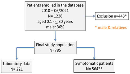 This study’s data were obtained from a database initially comprising 1228 male and female patients with FVII deficiency. These patients, ranging in age from 0.1 to 80 years, were associated with three coagulation treatment centers located in Duisburg, Lübeck, and Kiel, Germany. For our analysis, we first excluded 28 relatives, and subsequently 415 males, from the database, meaning that the final study cohort included n = 785 women with FVII deficiency (Figure 1).