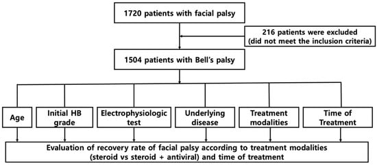 A retrospective analysis was conducted on 1708 patients diagnosed and hospitalized with Bell’s palsy at Kyung Hee University Hospital from January 1986 to May 2023. Exclusion criteria included congenital malformations, trauma, infections, otitis media, tumors, metabolic diseases, systemic diseases, autoimmune diseases, age below 20 years, unclear timing of Bell’s palsy onset, insufficient medical records, receiving only supportive management, and loss to follow-up. The patients were stratified based on gender, age at initial visit, initial House–Brackmann (HB) grade, electroneurography (ENoG) results, electromyography (EMG) results, presence or absence of diabetes and hypertension, treatment method, treatment start time, and recovery rate (Figure 1).