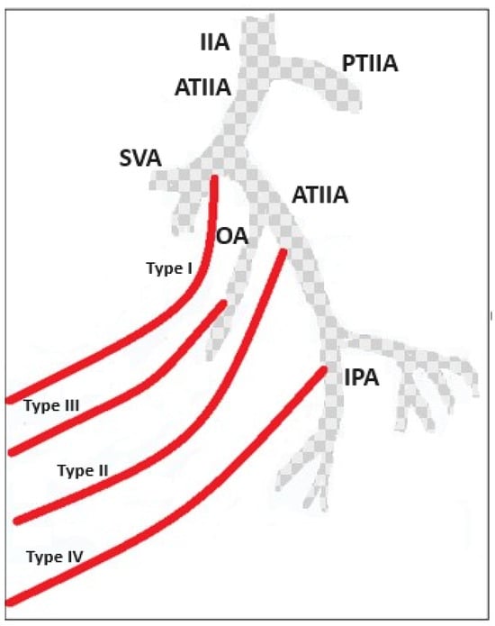 Type I: PA originating from the anterior division of the IIA, in a common trunk with the SVA 28.7%,
