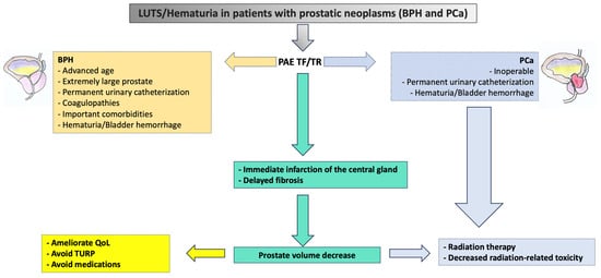 Concomitant ischemic heart disease and low left ventricle ejection fraction are not a contraindication to PAE, and several case reports have been reported in these high-risk patients with important LUTS improvement [,,]. In patients with severe pain and bleeding caused by advanced prostate cancer, PAE appears as one of the most reliable and advantageous options [].