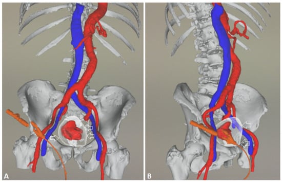 Angio-CT 3D, (A) frontal view, (B) right oblique anterior view; empty arrows indicate the bladder, with a huge hypervascular tumoral mass inside stained in red. The patient-specific 3D models were displayed using ARTICOR® (Artiness srl, Milano, Italy) and obtained using a marching cube algorithm.