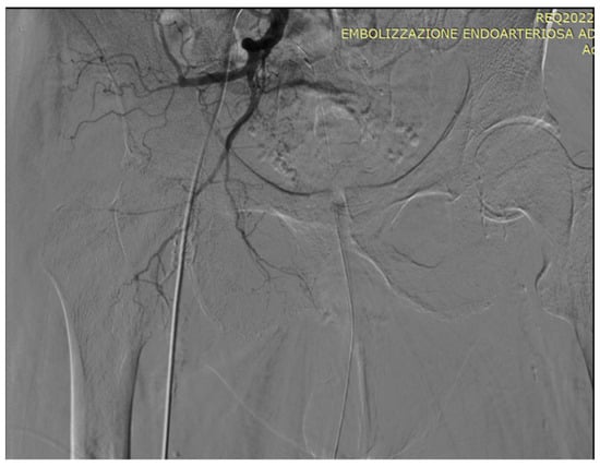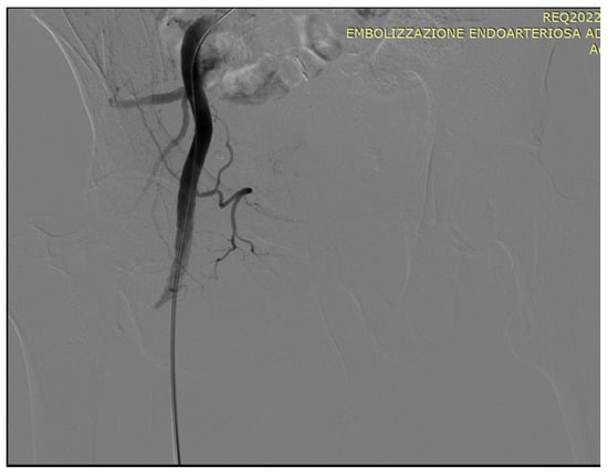 Left prostatic artery embolization (PAE) performed using the standard proximal embolization first, followed by the distal (PErFecTED) technique []; PAE was obtained by injecting a solution of microbeads (Embosphere 300–500 μm, Merit Medical, South Jordan, UT, USA) mixed with 9 mL of saline and 9 mL of contrast medium.