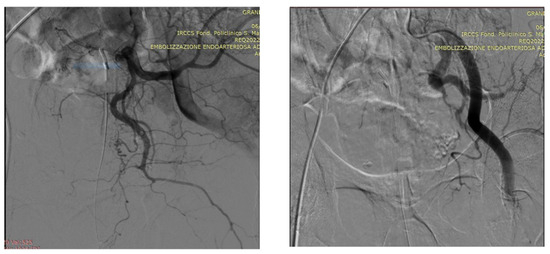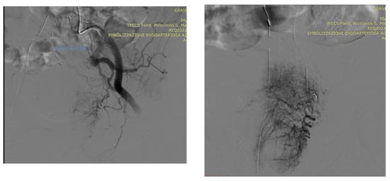As an illustration of our proposed algorithm (Figure 3), we describe a clinical complex case report in a patient with LUFT who underwent PAE as a rescue procedure for intractable urinary bleeding from his prostate cancer. A 92-year-old man, affected by PCa and with a long-term indwelling bladder catheter (IBC), was admitted for a massive bladder hemorrhage. The patient, a former smoker, had blood hypertension treated with an ACE inhibitor; he presented with elevated PSA levels of 62 ng/mL, and his symptomatology was limited to nocturia causing 2–3 nocturnal lifts. A prostatic biopsy revealed a Gleason score of 7 (3 + 4) and adenocarcinoma in 6 of 12 specimens. Laboratory blood test values were within the reference range; chest X-ray, bone scan, and thoracic and abdominal CT scan were negative. The chest CT scan showed initial pulmonary fibrosis as an incidental finding. Because of the advanced stage of the disease and pulmonary fibrosis, the primary treatment modality was hormonal therapy: so, he assumed Bicalutamide 50 mg/day and Triptorelin, a synthetic agonist analog of gonadotropin-releasing hormone (GnRH), 11.25 mg/every 3 months. After 6 months, Triptorelin was discontinued, and only Bicalutamide 150 mg/day was prescribed. In March 2019, he underwent Choline PET-CT, demonstrating common iliac and aortic nodal chains with metastatic involvement, and in June, his PSA was 20.78 ng/mL. In January 2020, his PSA was 27 ng/mL; it increased to 38 ng/mL in May, and in August the value was 53 ng/mL; testosterone was <0.1 ng/mL. At this point, a Choline PET scan showed several skeletal secondary localizations in the dorsal and lumbar vertebral bodies, the pelvis, and the 11th right rib. In September 2020, Enzalutamide 160 mg daily was started, and he continued Triptorelin 3.75 mg monthly: one month later PSA was 20.47 ng/mL and in January 2021 the value was 19.24 ng/mL. Although PSA decreased, the patient had urinary retention, and an IBC was positioned and replaced every four weeks. In May 2021, PSA reached 44 ng/mL, Enzalutamide was stopped and Abiraterone, 1000 mg daily, and Prednisone 5 mg × 2 daily, were started continuing Triptorelin. In July 2021, PSA was 72 ng/mL and in November the value climbed to 334 ng/mL: the oncologist replaced Abiraterone with Megestrol, 160 mg daily, continuing Triptorelin. In January 2022, the patient started to have hematuria that rapidly became a gross hemorrhage with clot formation and urinary obstruction. In addition to urinary obstruction and massive hemorrhage, the patient also suffered three syncopal episodes. He was immediately hospitalized, and a three-way IBC was positioned for continuous bladder irrigation to prevent blood clots. His Hb dropped from 14.5 g/dL to 7.9 g/dL, and a blood transfusion was done; despite continuous bladder irrigation, blood was still present in the urine. Chest and abdominal CT scans revealed large bleeding associated with PCa expansion into the bladder, involving the neck and trigone (Figure 4). To stop the bleeding, a PAE was performed. The procedure is described in Figure 5, Figure 6, Figure 7, Figure 8 and Figure 9. Hematuria was resolved one week after the procedure, LUTS ameliorated, and quality of life improved significantly. The patient died at the age of 93 in the fourth post-procedure month of respiratory insufficiency due to pulmonary fibrosis.
