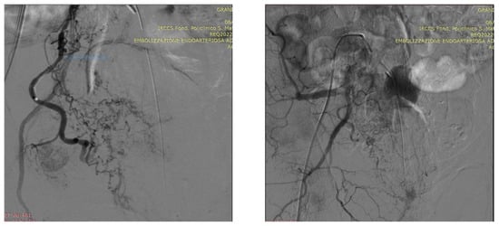 - Delgal, A.; Cercueil, J.P.; Koutlidis, N.; Michel, F.; Kermarrec, I.; Mourey, E.; Cormier, L.; Krausé, D.; Loffroy, R. Outcome of transcatheter arterial embolization for bladder and prostate hemorrhage. J. Urol. 2010, 183, 1947–1953. [Google Scholar] [CrossRef] [PubMed]